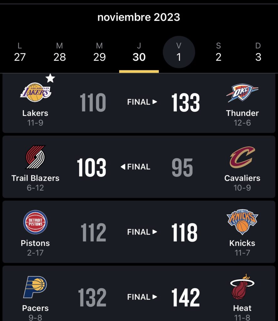 En una jornada de la NBA llena de sorpresas, los jóvenes de Oklahoma dejaron atónitos a los Lakers con una victoria destacada. Los emocionantes duelos decididos por estrecho margen de puntos vieron a Charlotte y Atlanta imponerse sobre sus rivales. Además, Miami se llevó la victoria en un partido de alta anotación frente a Indiana, mientras que el Chef Curry deleitó al sazonar a los Ángeles Clippers en un enfrentamiento épico. Así, la NBA cerró el mes de noviembre con emociones y momentos inolvidables en la cancha.